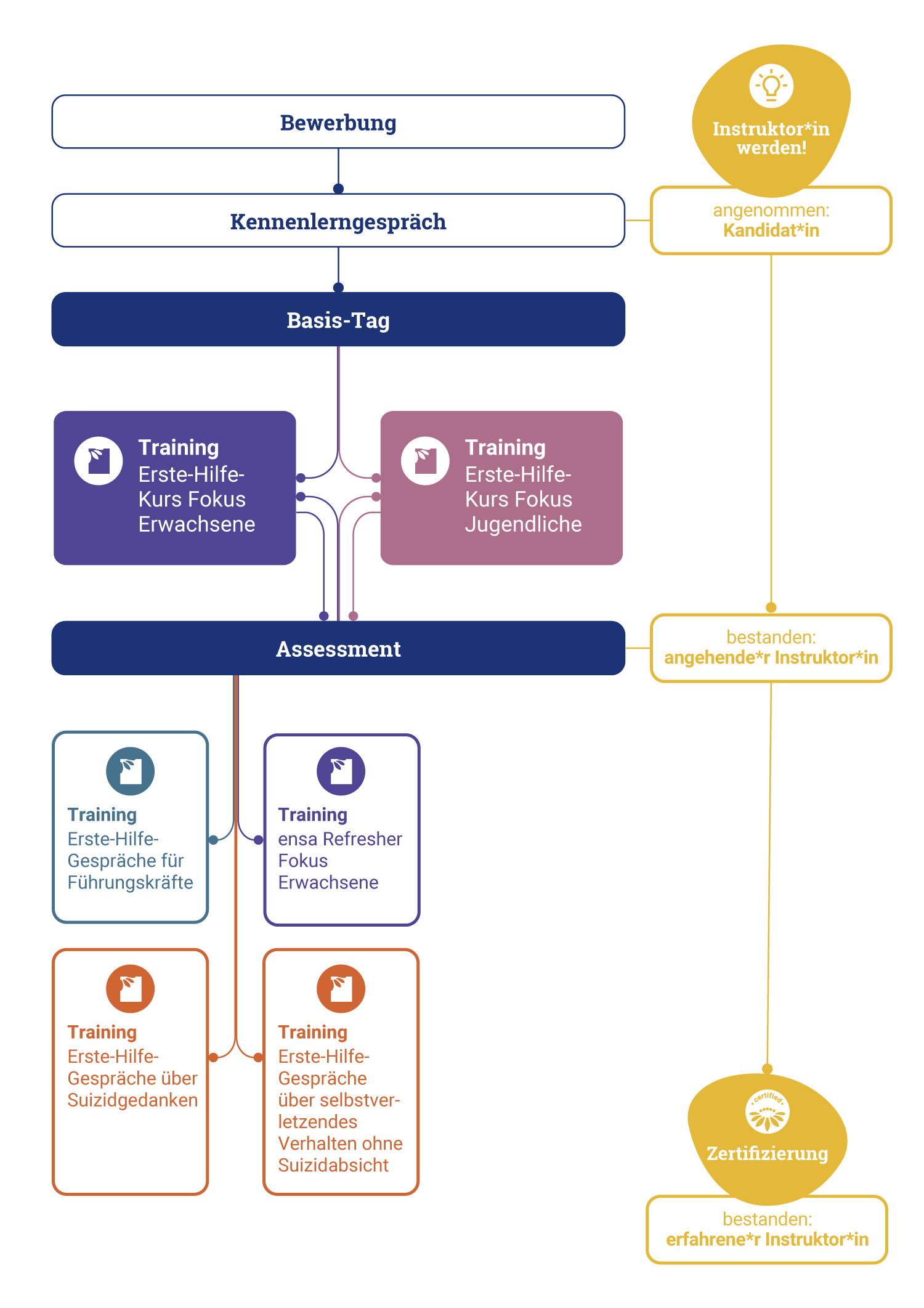 Die ensa Instruktor*innen-Ausbildung besteht aus verschiedenen Bausteinen. In einem ersten Schritt besuchen Sie den Basis-Tag, gefolgt vom Training Erste-Hilfe-Kurs Fokus Erwachsene oder Jugendliche. Ob Sie das Training Fokus Erwachsene oder Jugendliche absolvieren, ist Ihnen überlassen. Als Voraussetzung müssen Sie den entsprechenden Kurs vorgängig als Teilnehmer*in besucht haben, didaktische Erfahrung sowie Fachwissen in den entsprechenden Themengebieten der psychischen Gesund- und Krankheit aufweisen.